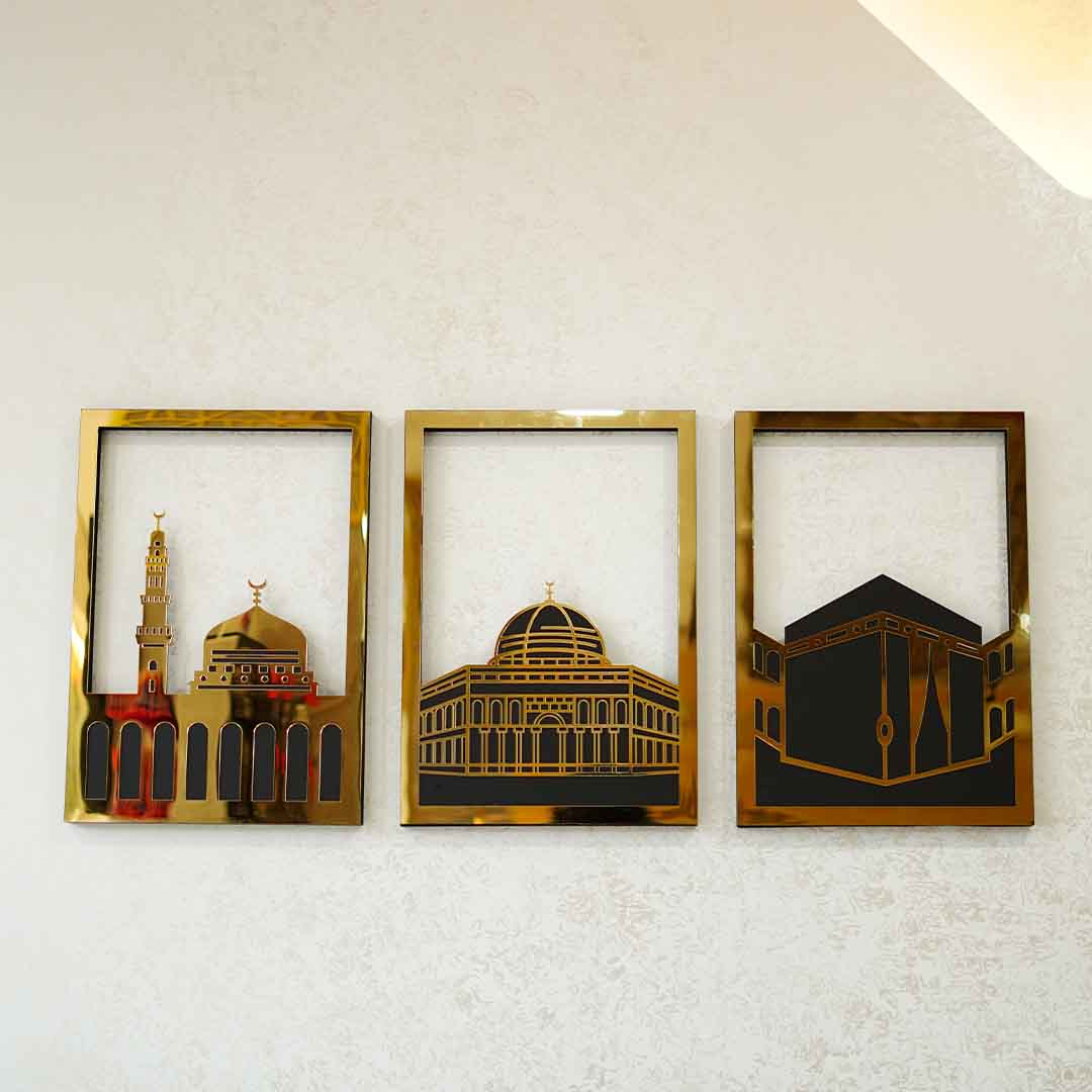 This Three Holy Masjid Wall Art features a stunning depiction of three sacred mosques, making it the perfect high-quality home decor for any spiritual or cultural setting. Elevate your space with this beautifully crafted wall decor that pays homage to these holy and revered places.Crafted from high-quality Acrylic Mirror Gold, this wall art adds a luxurious and reflective touch to any space. Each piece measures 18 x 13 inch inches, creating a grand total size of 36 x 15 inches when displayed together. Bring the beauty and serenity of these revered holy sites into your home with this stunning wall decor set.